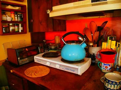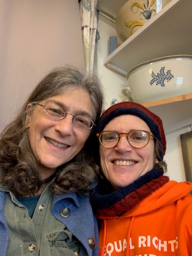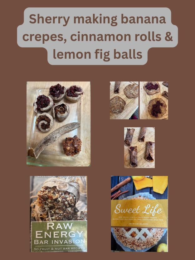 Photos by Sherry Zitter: 1. Sherry (on left) & her wife, Forest Otter. 2. Their kitchen. 3. One lemon fig ball; one dehydrated banana not rolled up yet; two banana cinnamon rolls with apricot filling; three banana rolls with three-berry filling; banana crepes with various fillings; (all nut/seed/gluten-free, from “Sweet Life” by Myriam Bakhti); two vegan recipe books mentioned by Sherry in her interview