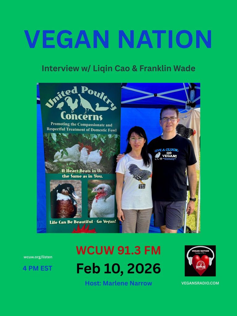 Tuesday, December 16, 2025 at 4 PM EST. WCUW 91.3 FM. On-Air broadcast also online: wcuw.org/listen. Hosted by Marlene Narrow, Worcester, Massachusetts, USA. Archives: vegansradio.com. Vegan Nation is a 1/2-hour radio showfeaturing vegan music, news, events and interviews. On-Air since January 2015. Thank you for caring enough to hear and be heard.