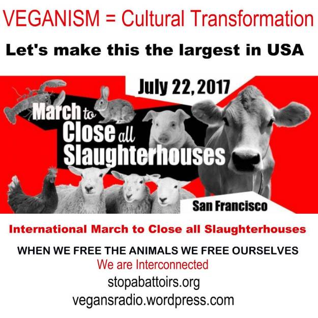 San Francisco March to Close All Slaughterhouses (July 22, 2017) – Diane Gandee Sorbi (Part 1 interview) stopabattoirs.org DxE logo design (included within top poster) by Eduardo M. Nauiack