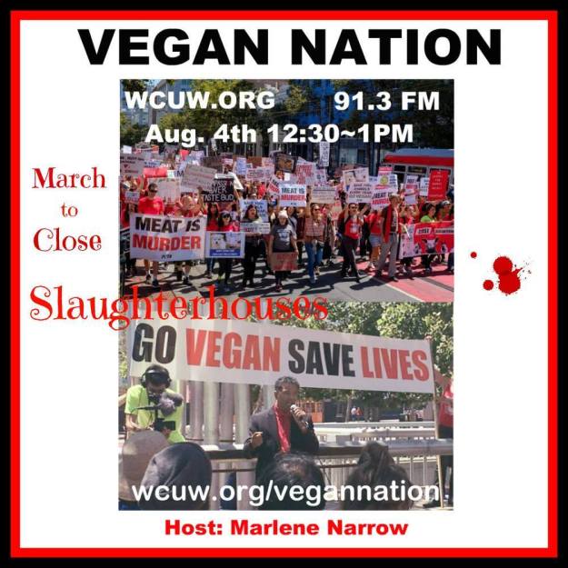 VEGAN NATION Radio featuring the International March to Close All Slaughterhouses – San Francisco, CA, USA. Hosted by Marlene Narrow, WCUW 91.3 FM Worcester, Massachusetts, USA. August 4, 2017. On-Air and listen worldwide online streaming at wcuw.org