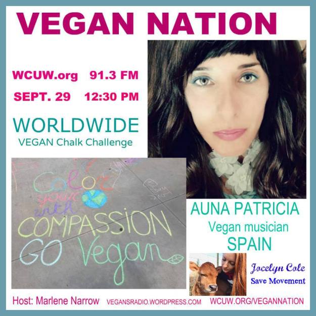 VEGAN NATION RADIO USA 91.3 FM, airing every TUESDAY 4 PM EST WCUW Worcester, Massachusetts. Live-streaming worldwide at wcuw.org. Hosted by Marlene Narrow. September 29, 2017 interview with Vegan activist/musician, Aúna Patricia in Javea, Spain. Also featuring the worldwide Vegan Chalk Challenge (#veganchalkbomb: Sept. 30-Oct.1) with Jocelyn Cole, organizer for The Save Movement, and Portland Animal Save in Oregon.
