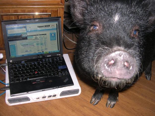 Dianne Rochenski’s rescued potbellied pig, Tiny Belle, listening to Vegan Nation radio: