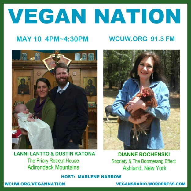 VEGAN NATION RADIO USA 91.3 FM, On-Air every Tuesday 4PM ~ 4:30PM ET, hosted by Marlene Narrow WCUW Worcester, Massachusetts. Archives: vegansradio.wordpress.com and wcuw.org/vegannation. May 10, 2018, Interviews with Lanni Lantto & Dustin Katona, a vegan couple who run a spiritual retreat house, Priory Retreat House, serving 100% vegan meals, in the Adirondack Mountains in New York.