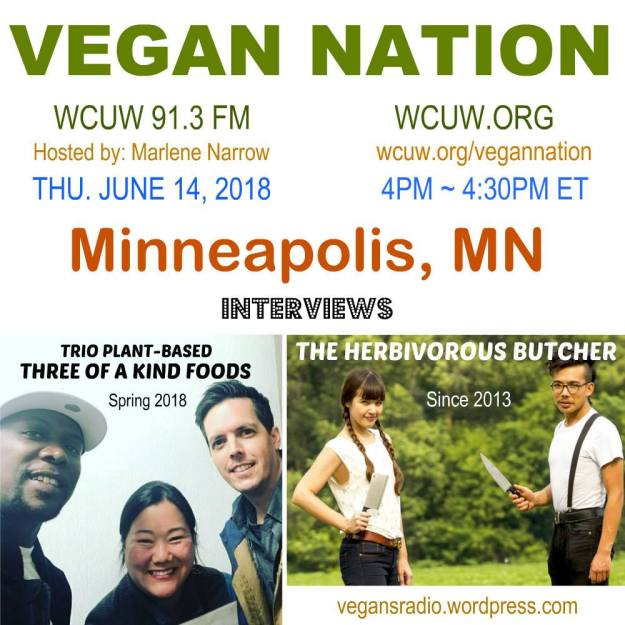 VEGAN NATION RADIO USA WCUW 91.3 FM, broadcasting every Tuesday 4PM to 4:30PM ET on WCUW.org and 91.3 FM in Massachusetts. Hosted by Marlene Narrow, Worcester, MA. June 14, 2018 interviews with vegan entrepreneurs in Minneapolis, Minnesota. The Herbivorous Butcher, brother & sister, Aubry & Kale Walch. theherbivorousbutcher.com