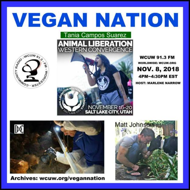 Join us on Vegan Nation radio WCUW 91.3 FM. Featuring Matt Johnson and Tania Suarez. Hosted by Marlene Narrow, Worcester, Massachusetts, USA. November 8, 2018. Listen to the live-stream broadcast from anywhere in the world here: wcuw.org. Archived shows: wcuw.org/vegannation and vegansradio.wordpress.com