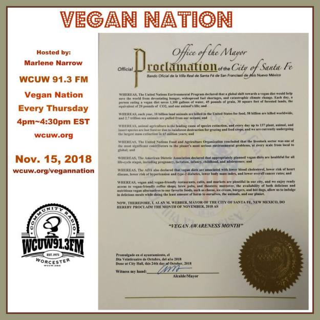 Vegan Nation airs every Tuesday on WCUW 91.3 FM radio in Worcester Massachusetts, USA, and can be heard worldwide at: wcuw.org. Hosted by Marlene Narrow, Worcester, Massachusetts. Thank you for caring enough to hear and be heard, Archives: vegansradio.com