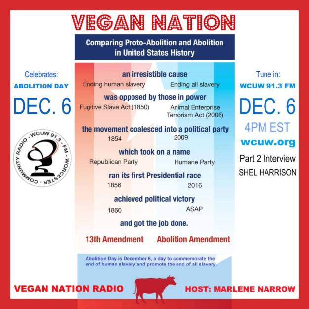 Vegan Nation celebrates ABOLITION DAY! Tune in on Abolition Day, December 6th (12/06/18) to hear Part 2 of the interview with Shelley Harrison, the primary author/editor of the Abolition Amendment. This show is a rebroadcast of Shel’s 2016 Vegan Nation interview, in which he explains the full text of the proposed constitutional amendment, Abolition Amendment, published on December 6, 2016. ALL VEGAN NATION INTERVIEWS WITH SHELLEY HARRISON