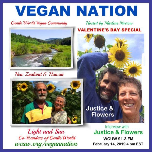 Vegan Nation radio features an interview with Flowers & Justice, who’ve been married 27 years, and who are volunteers at Gentle World. Gentle World is a nonprofit educational center with two locations – New Zealand (situated on 454 acres) and Hawaii (situated on 34 acres). Gentle World was founded (50 years ago) by Light & Sun, who’ve been married since 1967. Discussion includes exciting culinary information, history of Gentle World, and Vegan Land (Vegan Land is an emerging eco-village, an opportunity for Vegans, on the big island of Hawaii).