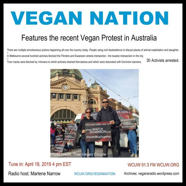 Vegan Nation radio features Monday’s countrywide protest in Australia, by hundreds of Vegan activists, who are bringing light to the one year anniversary of the documentary, Dominion. This action is dubbed the largest animal rights protest in the world.
