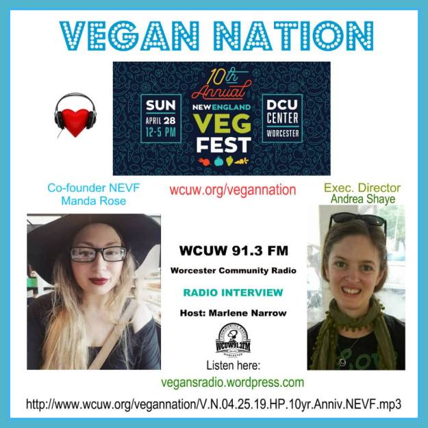 Vegan Nation radio features the 10th Annual New England VegFest! Listen to this fabulous interview with Manda Rose, co-founder of New England VegFest, and Andrea Shaye, executive director – NEVF. April 25, 2019 WCUW 91.3 FM Host: Marlene Narrow (Featured in The Lobe)