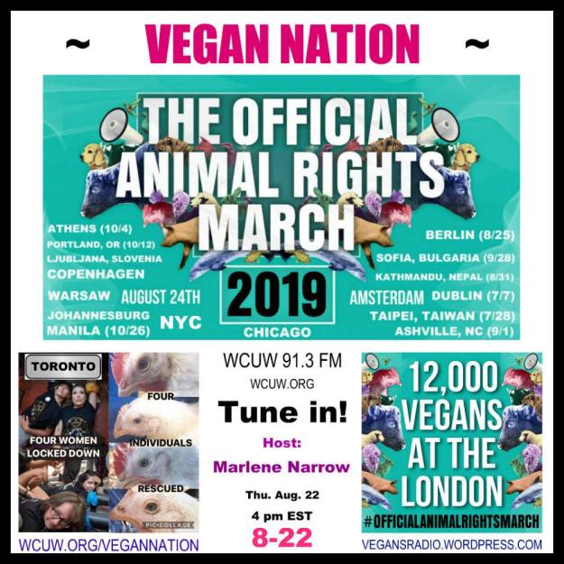 Vegan Nation radio features the Official Animal Rights March 2019. Also including 4 Toronto, Canada nonviolent direct action events (8/17-8/19). Tune in! WCUW 91.3 FM worldwide online:wcuw.org/listen August 22, 2019, 4 pm to 5 pm Eastern time. Hosted by Marlene Narrow, Worcester, Massachusetts, USA. Archives;vegansradio.wordpress.com