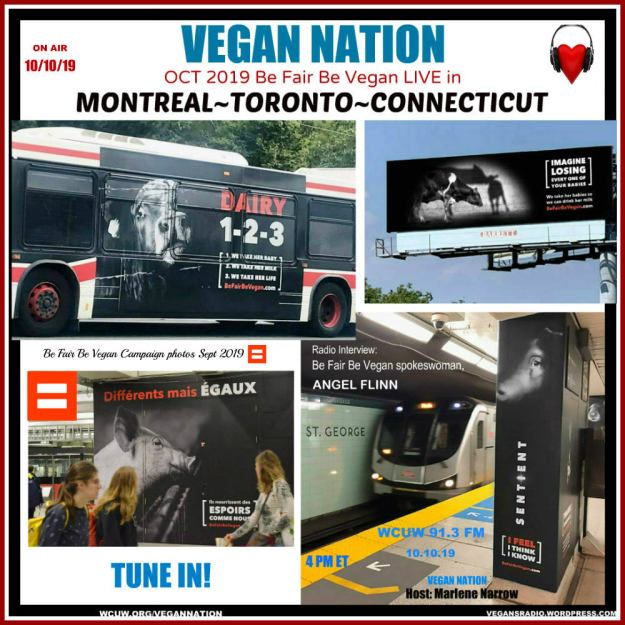 Vegan Nation USA radio features the Be Fair Be Vegan international nonprofit advertising campaign, currently running/live in Canada (Montreal & Toronto) and Connecticut (USA). Radio interview with Angel Flinn, Be Fair Be Vegan spokeswoman. Tune in! October 10, 2019, 4 pm to 5 pm EST at WCUW 91.3 FM, online: wcuw.org/listen. Hosted by Marlene Narrow, Worcester, Massachusetts, USA. Archives:vegansradio.wordpress.com and at the radio station index: wcuw.org/vegannation. https://www.facebook.com/events/401655650537134/