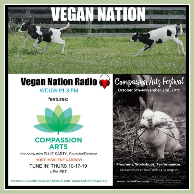 Vegan Nation features Compassion Arts Festival: Massachusetts – New York – Los Angeles. Interview with CAF founder/director, Elli Sarty. Tune in! Oct. 17, 2019 4pm~5 pm EST. Hosted by Marlene Narrow, WCUW 91. 3 FM, Worcester, Massachusetts, USA. wcuw.org Archives: vegansradio.wordpress.com