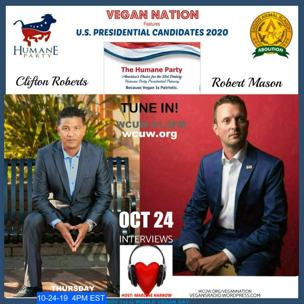 Vegan Nation USA Radio features The Humane Party‘s two prospective candidates seeking nomination for the 2020 United States Presidency: Robert Mason (in Texas), and Clifton Roberts (in California).