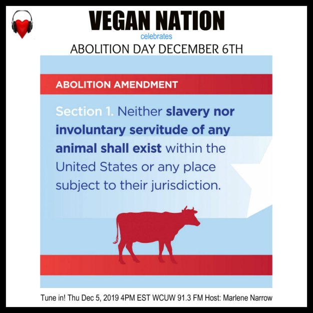 Vegan Nation celebrates Abolition Day (Dec. 6th) & the Abolition Amendment (proposed amendment to US Constitution). Hosted by: Marlene Narrow, Worcester, Massachusetts, USA. Tune in! December 5, 2019. The 2019 show was a rebroadcast of the 2018 shows (Part 1 & Part 2) linked above. Archives: vegansradio.wordpress.com. Thank you for caring enough to hear and be heard.