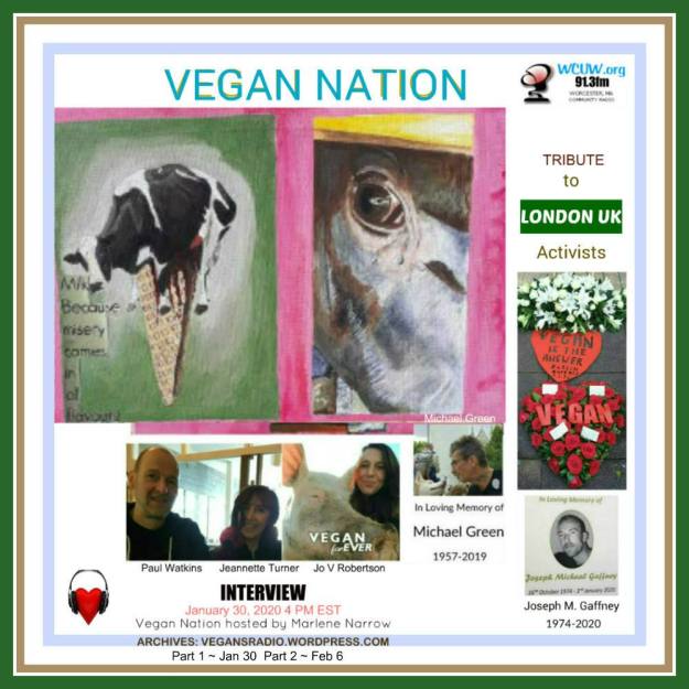 Tune in January 30, 2020 Listen here worldwide: wcuw.org/listen. Hosted by Marlene Narrow, WCUW 91.3 FM Worcester, Massachusetts, USA. Archives: vegansradio.wordpress.com Interview with Jeannette Turner, Paul Watkins, Jo V Robertson. Memorial to Michael Green (1957-2019) and Joseph M. Gaffney (1974-2020).