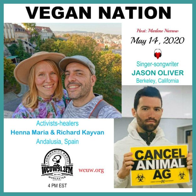 Vegan Nation interviews Jason Oliver, singer-songwriter/AR activist; and Henna Maria & Richard Kayvan, activists-healers. Hosted by Marlene Narrow, WCUW 91.3 FM, Worcester, Massachusetts, USA. Join us! May 14, 2020 (4 pm to 5 pm Eastern time) Listen here: wcuw.org/listen, and on your radio dial in New England WCUW 91.3 FM.