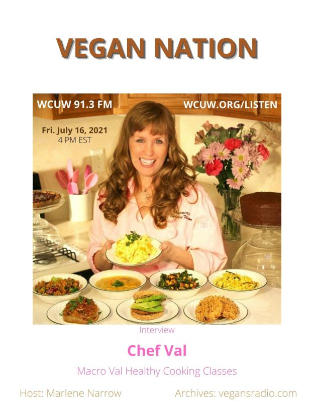 Vegan Nation radio features an interview with Valerie Wilson-Macro Val. July 16, 2021 at 4 pm (EDT) Eastern DaylightTime. WCUW 91.3 FM (in New England) and online at: wcuw.org/listen. Hosted by Marlene Narrow, Worcester, Massachusetts, USA. Chef Val joins us from Michigan. Vegan Nation archives: vegansradio.com.