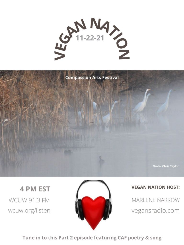 Vegan Nation features a Part 2 episode of the Compassion Arts Festival. Music and poetry. Tune in Monday, November 22, 2021 at 4 PM EST to listen to this 1/2 hour vegan music and news radio show. Hosted by Marlene Narrow, Worcester, Massachusetts, USA. WCUW 91.3 FM online worldwide: wcuw.org/listen (Vegan Nation Mondays at 4) 4 pm to 4:30 pm Eastern time. Archived shows: vegansradio.com. Thank you for caring enough to hear and be heard. Featuring the music of Ellie Sarty, Danny Hamilton, and Risa Branch. Featuring the writings of Mandy-Suzanne Wong, and the poetry of Gretchen Primack, and Stewart Mitchell. (Part 1 aired on 11-15-21)