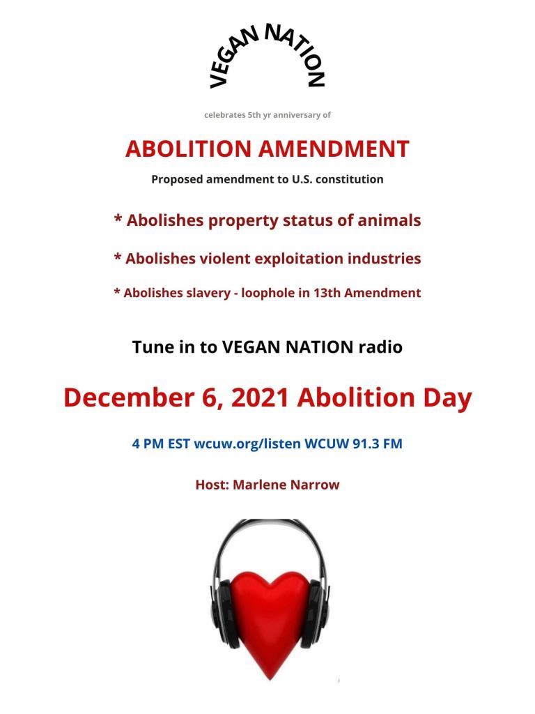 The Abolition Amendment was written by volunteers at the vegan political party in USA, Humane Party. The Abolition Amendment can be used by legislators from any political party. Upon ratification, it will abolish the property status of animals, end all animal exploitation industries, and abolish slavery (see Section 1 – cancels current loophole in the 13th Amendment). Tune in to Vegan Nation on December 6, 2021 ABOLITION DAY. (Part 2 airs next week, Dec. 13, 2021 4 PM EST.) Listen to the ON AIR radio broadcast here: WCUW 91.3 FM wcuw.org/listen 4 PM (4 pm to 4:30 pm Eastern time). Hosted by Marlene Narrow, Worcester, Massachusetts, USA. Vegan Natin archives: vegansradio.com. Thank you for caring enough to hear and be heard; and much thanks for your vegan activism. Veganism is the practice of normalized nonviolence & nondiscriminatory compassion. abolitionamendment.wordpress.com