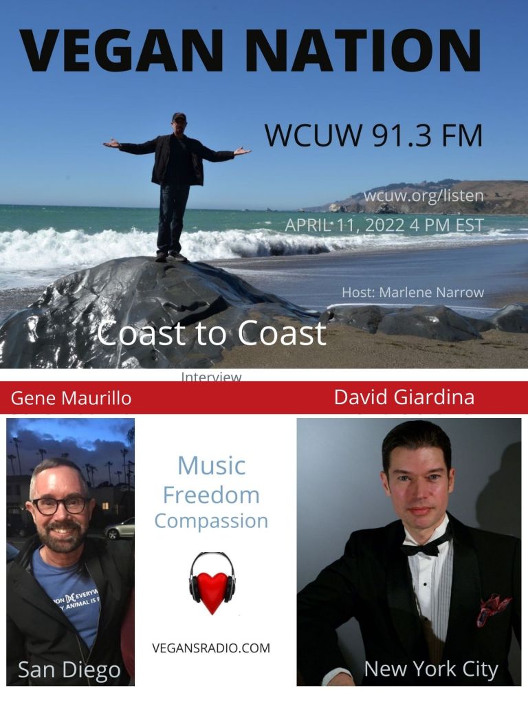 Vegan Nation interview with vegan activists/musicians, David Giardina (New York City) and Gene Maurillo (San Diego). Join us for this lively discussion on everything Vegan, including compassion and freedom for all. April 11, 2022. Listen to the On-Air radio broadcast here: WCUW 91.3 FM wcuw.org/listen. Hear it again in the Vegan Nation archives: vegansradio.com. Vegan Nation brings you a 1/2 hour of vegan news, music, events and interviews, every week, about the vegan evolution revolution happening worldwide. Thank you for caring enough to hear and be heard. Host Marlene Narrow, Worcester, Massachusetts, USA.
