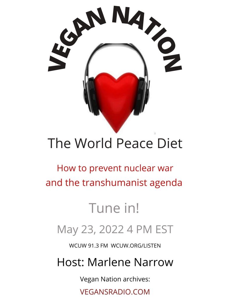 Vegan Nation features an interview with Dr. Will Tuttle, author of The World Peace Diet: Eating for Spiritual Health and Social Harmony. In this 2 Part series interview, we discuss the importance of animal liberation in relation to the global crisis & wars. Tune in Mon May 23, and again Mon May 30, 2022. Vegan Nation airs weekly on WCUW 91.3 FM, online: wcuw.org/listen (Mondays) 4 pm Eastern time (4PM to 4:30PM EST). Vegan Nation, a 1/2 hour radio show, features vegan music, news and events. Hosted by Marlene Narrow, Worcester, Massachusetts, USA. worldpeacediet.com