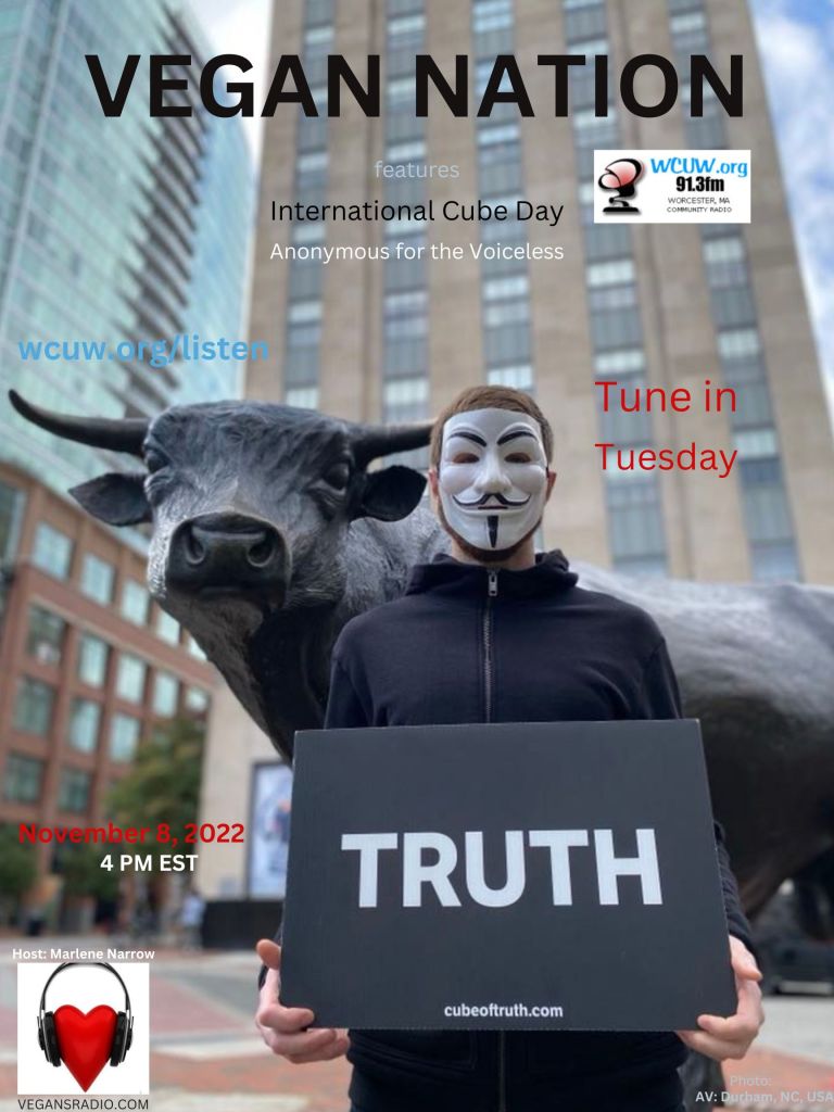 Tune in Tuesday to Vegan Nation, November 8, 2022. Featuring International Cube Day Anonymous for the Voiceless. Listen worldwide online: wcuw.org/listen 4 PM EST. Hear the show On-Air: WCUW 91.3 FM. Hosted by Marlene Narrow, Worcester, Massachusetts, USA. Archives can be heard anytime at: vegansradio.com. Vegan Nation is a 1/2 hour radio show. On-Air weekly since 2015. Thank you for caring enough to hear and be heard. In this Vegan Nation broadcast, we’ll hear snippets of AV Cube of Truth live-streams from the 6th International Cube Day, Nov 5th. (Photo- AV: Durham, NC, USA) Music: “Turkey Song” “Chicken Song” by Will Tuttle.