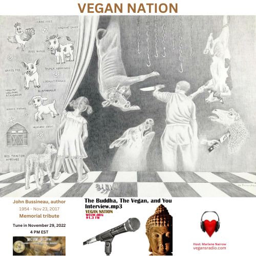 Vegan Nation features a memorial tribute to John Bussineau, author of The Buddha, The Vegan, and You. Tune in Tuesday, November 29, 2022, 4 pm EST. On-Air WCUW 91.3 FM, and streaming online: wcuw.org/listen. Hosted by Marlene Narrow, Worcester, Massachusetts, USA. Vegan Nation is a 1/2 hr radio show, on-air since 2015. Music in this episode by Will Tuttle. (Drawing “Comfortable Lies” by Jo Frederiks)