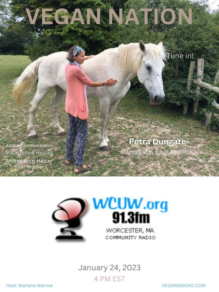 Vegan Nation features an interview with Animal Reiki healer/teacher, and Animal Communicator, Petra Dungate (vegan). Petra joins us from Ramsgate, Kent, England. We’ll hear stories about finding lost animals, helping with health issues, and communicating with ascended animal companions, as well as how we can promote veganism on a daily basis, and also ways to help Vegans cope with the stress of living in this current global nonvegan paradigm – where animals (human and other-than-human animals) are exploited & harmed. Music in this episode is “What are they hiding?” by Jason Oliver (Dayzee Deva) and Eva Hamer. Also the “Cow Song” and “Chicken Song” by Will Tuttle.