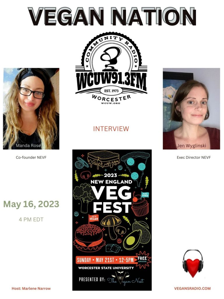 Vegan Nation features New England VegFest 2023. Interview with Manda Rose, Co-Founder; and Jennifer Wyglinksi, Exec Director. Tune in Tuesday, May 16, 2023! 4 pm EDT. WCUW 91.3 FM Worldwide online: wcuw.org/listen Hosted by Marlene Narrow, Worcester, Massachusetts, USA. Archives: vegansradio.com. (Music in this episode: Vegan Smythe, Will Tuttle, Donna De Lory)