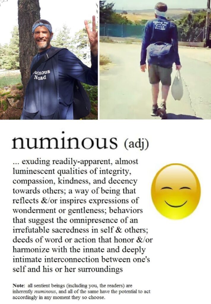 Sept 19th – features my interviews with Scaughdt, as well as snippets of his messages on his website, Inspiring The Altruistic Moment. (On his 8/30/23 Blog, “z Whereabouts of mySelf”, we learn that in the last days of August 2023, the Numinous Nomad left Chattanooga, Tennessee.) Scaughdt is walking along America’s state highways, never asking anyone for food or shelter, carrying neither personal ID, camera, phone, computer, rain-gear, sleeping bag, money (nor accepting any money), and fasting until offered (vegan) food. This trek demonstrates his faith in radical kindness, consistent compassion and joyful self-sacrifice.