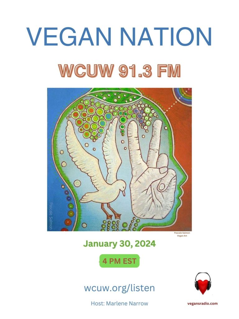 What food and practices promote Freedom and Peace? Why? How? Hear about this and more…tune in Tuesday, January 30, 2024. Vegan Nation WCUW 91.3 FM. 4 pm Eastern Standard Time. Online: wcuw.org/listen . Hosted by Marlene Narrow, Worcester, Massachusetts, USA. Archived shows: vegansradio.com .