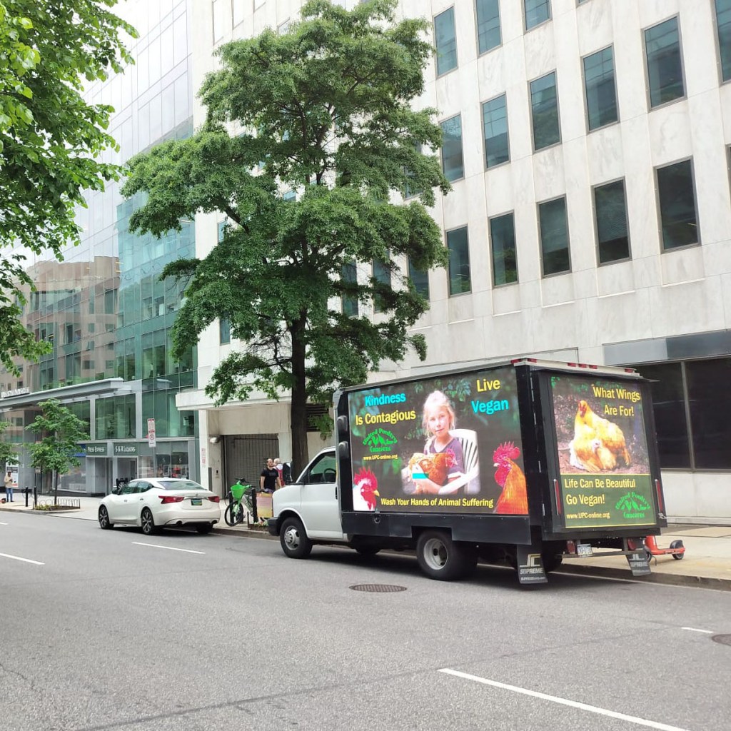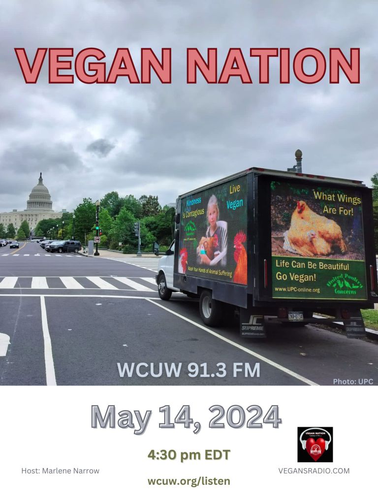 Vegan Nation is a weekly, informational 1/2 hour radio show (On-Air since 2015) featuring vegan music, news, events, and interviews – locally, nationally, and internationally. Thank you for caring enough to hear & be heard, for your support of nonprofit Community radio, and your compassionate Vegan activism. Vegan Nation PHOTOS. (Below: “For three days, starting on International Respect for Chickens Day, May 4th, United Poultry Concerns ran our ads “What Wings Are For! Life Can Be Beautiful Go Vegan!” and “Kindness is Contagious – Live Vegan – Wash Your Hands of Animal Suffering” on a truck driving around downtown Washington, DC for 8 hours each day. This is in addition to our ads running at 14 Bike Share locations through the entire month of May in honor of our annual International Respect for Chickens Day May 4/month of May campaign.”- UPC)