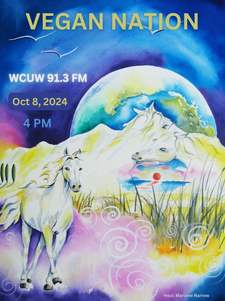 Listen to the replay at the link above (29 minutes, 55 seconds audio .mp3). Thank you. Vegan Nation On-Air Tuesday, October 8, 2024. Tune in 4 PM EDT, WCUW 91.3 FM Listen worldwide online at: wcuw.org/listen. Hosted by Marlene Narrow, Worcester, Massachusetts, USA.
