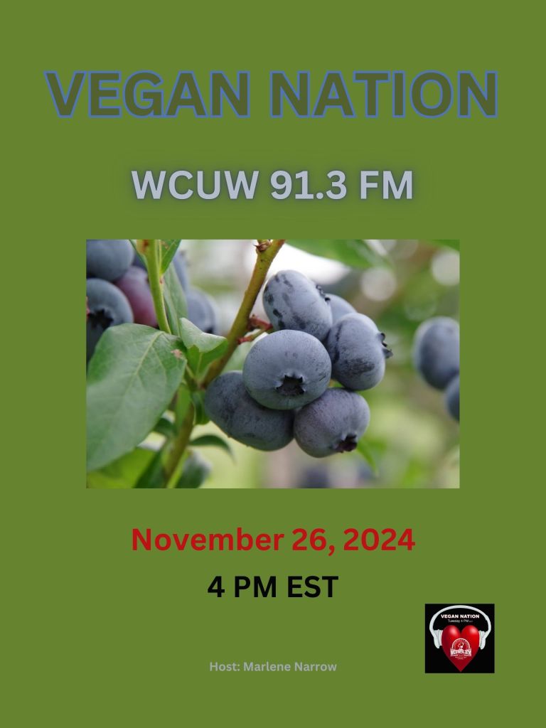 Listen to the replay at the link above (28 minutes 35 seconds audio .mp3). Thank you. Happy Thanksliving! Tuesday, November 26, 2024, 4 PM EST. Vegan Nation features vegan music & news in this Thanksliving~Thanksgiving Special. Listen here: WCUW 91.3 FM and online: wcuw.org/listen. Hosted by Marlene Narrow, Worcester, Massachusetts, USA. vegansradio.com