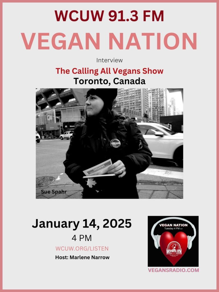 Listen to the replay at the link above (29 minutes 11 seconds audio .mp3). Thank you. Vegan Nation features an interview with the co-founders of The Calling All Vegans Show, Sue Spahr and Alec Bosse! The Calling All Vegans Show broadcasts from the Wishbone Animal Rights Lab in Toronto, Canada. Tues, Jan 14, 2025, 4 PM EST. Listen worldwide online: wcuw.org/listen WCUW 91.3 FM Hosted by Marlene Narrow, Worcester, Massachusetts, USA. Music: Antispeciste (Kreezy R, Paris, France) Vegan Nation archives: vegansradio.com. (Wishbone AR Lab on IG)