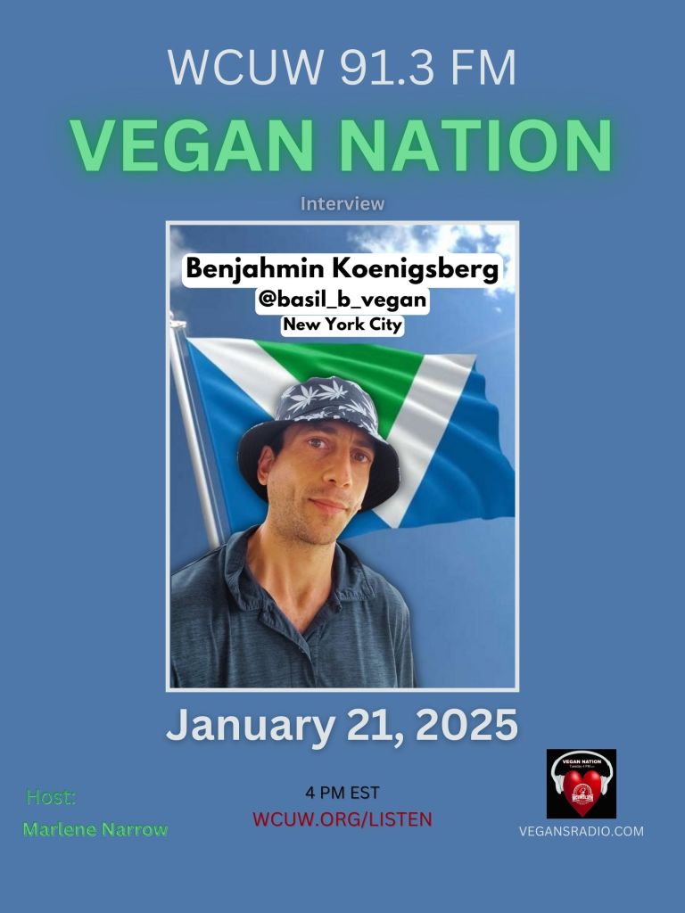 Listen to the replay at the link above (29 minutes 9 seconds audio .mp3). Thank you. Benjahmin’s 10-year Veganniversary was January 2, 2025. (Jan 2nd was also Vegan Nation’s 10th Anniversary On-Air, weekly, at WCUW 91.3 FM Worcester Community Radio.) January 21, 2025, Benjahmin Koenigsberg (Basil B Vegan) joins us from New York City for this exciting interview, as we hear his story and discuss his noble activism. 4 PM EST ~ WCUW 91.3 FM. Listen online: wcuw.org/listen. Hosted by Marlene Narrow, Worcester, Massachusetts, USA. Vegan Nation archives: vegansradio.com Vegan Nation is in The LOBE! Music: Mike Love