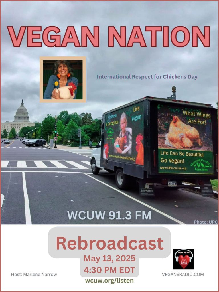 Hear the replay at the link above (28 minutes and 43 seconds, audio .mp3). Thank you. Tues., May 6, 2025, Vegan Nation celebrates International Respect For Chickens Day (May 4). The entire month of May is International Respect for Chickens Month. Tune in at 4 PM EDT on WCUW 91.3 FM wcuw.org/listen. Host: Marlene Narrow, Worcester, Massachusetts, USA. Vegan Nation archives: vegansradio.com. Vegan Nation has been On-Air, weekly, since 2015.