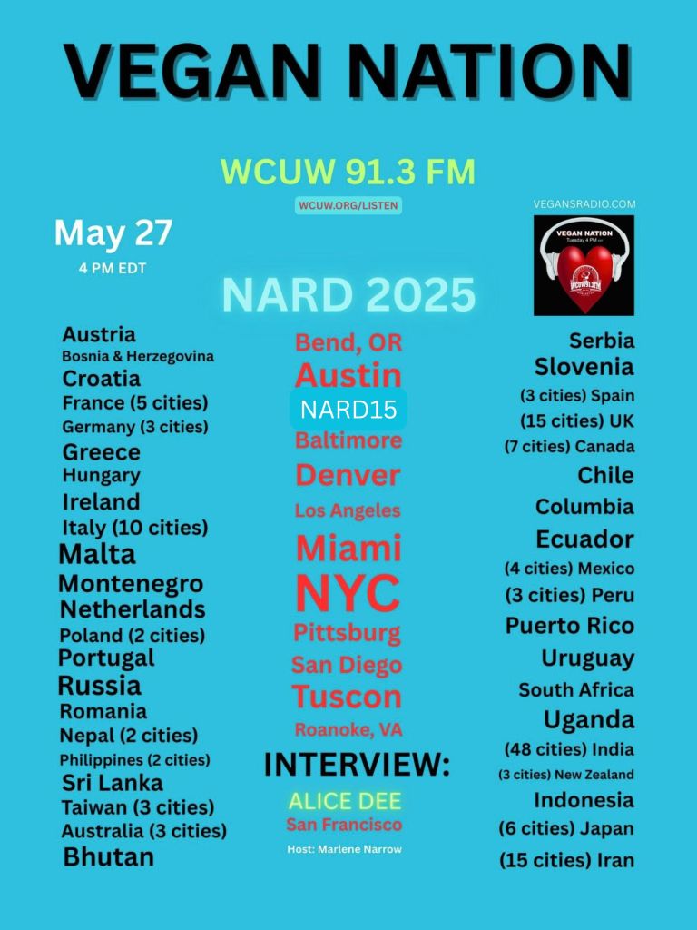 Listen to the replay at the link above (29 minutes and 10 seconds, audio .mp3.) Thank you. May 27, 2025, Vegan Nation features National Animal Rights Day (NARD), including an interview with Alice Dee, organizer of NARD15 San Francisco (Sunday, June 1st). Tune in Tuesday, May 27th, 4 PM EDT, on your radio dial 91.3 FM WCUW (in Massachusetts). Also hear the On-Air broadcast online: wcuw.org/listen. Hosted by Marlene Narrow, Worcester, Massachusetts, USA. Much thanks for tuning in! Archived shows: Vegan Nation. PHOTOS