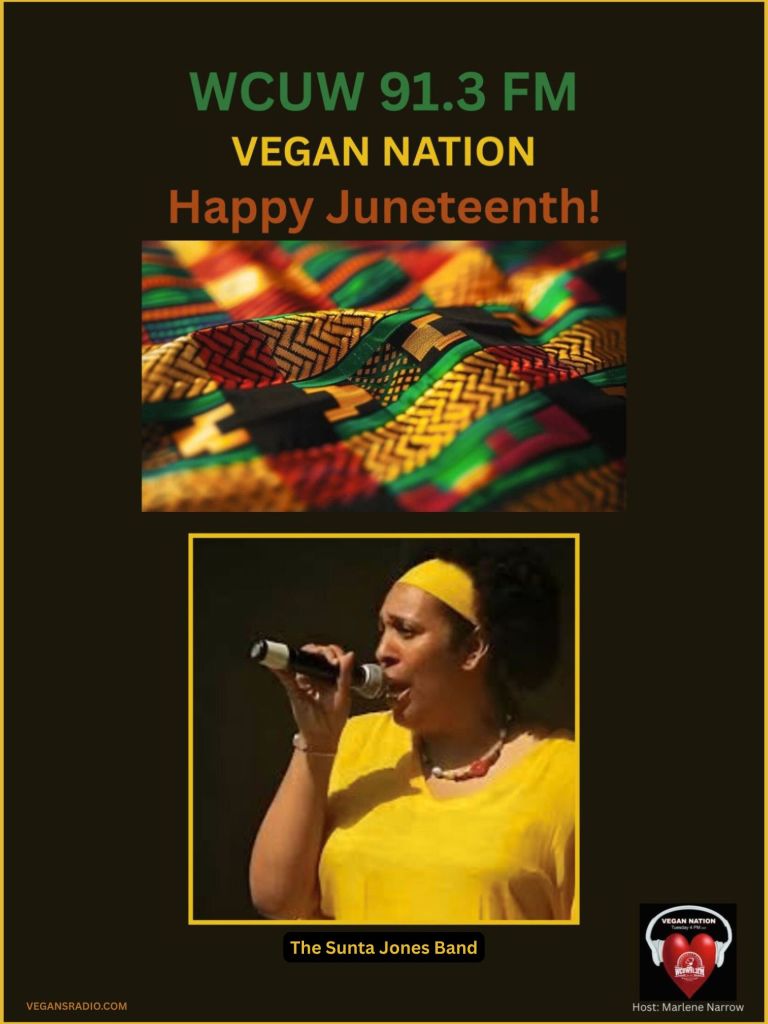 Happy Juneteenth! Free community Juneteenth performance by The Sunta Jones Band at New England Botanic Garden at Tower Hill, Boylston, Mass, USA, June 19th. Juneteenth 2025 vegan recipes by Physicians Committee for Responsible Medicine ~ Food for Life instructors. Soul Songstress, Sunta’s previous interviews and live in-studio performances on Vegan Nation.
