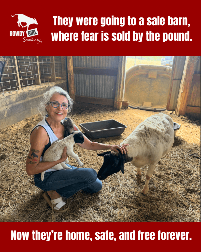 “A few weeks ago, we got a call from a Texas family who had to sell their land, and with it, their beloved sheep. Their only option was to take them to the sale barn, a place where animals are auctioned off by the pound… where fear fills the air and some never make it out alive. We said yes. And because of that one “yes,” seven sheep are now safe here at the sanctuary,and just days after arriving, one mama gave birth to a beautiful, healthy lamb. This baby was born into love, not fear. They’ll never know an auction block, a cage, or a tag on their ear, only sunshine, soft hay, and kindness. We’ll soon be launching our Sheep Naming Silent Auction, where you can bid to name one of these eight precious souls. Each name you give is a symbol of freedom, a promise that their lives matter. From the bottom of my heart, thank you for standing with us, for seeing these animals not as “livestock,” but as lives worth saving. Together, we’re showing the world that compassion is powerful enough to rewrite fate.“ – Renee King-Sonnen,founderRowdy Girl Sancutary, Waelder, Texas
