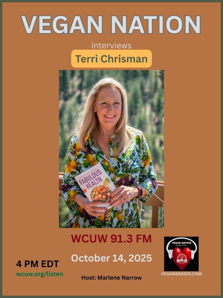 Hear the replay at the link above (28 minutes and 39 seconds, audio .mp3). Thank you. Vegan Nation features an interview with author, Terri Chrisman. October 14, 2025, 4 PM EDT. WCUW 91.3 FM (Music Playlist). Hear the show online (Tuesdays 4 PM EDT) at: wcuw.org/listen. Hosted by Marlene Narrow, Worcester, Massachusetts, USA. Vegan Nation archives: vegansradio.com. Thank you for caring enough to hear & be heard. We’re in The LOBE!