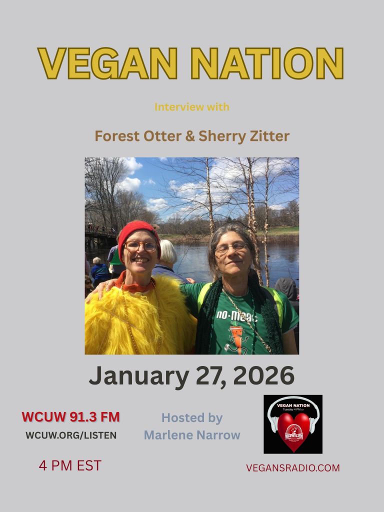 Hear the replay at the link above (28 minutes and 53 seconds, audio .mp3). Thank you. Sherry Zitter and Forest Otter celebrate their 18th Veganniversary with an in-studio Vegan Nation interview! Tune in Tuesday, January 27, 2026, 4 PM EST on WCUW 91.3 FM (and online: WCUW.org/listen). Hosted by Marlene Narrow, Worcester, Massachusetts, USA. PHOTOS