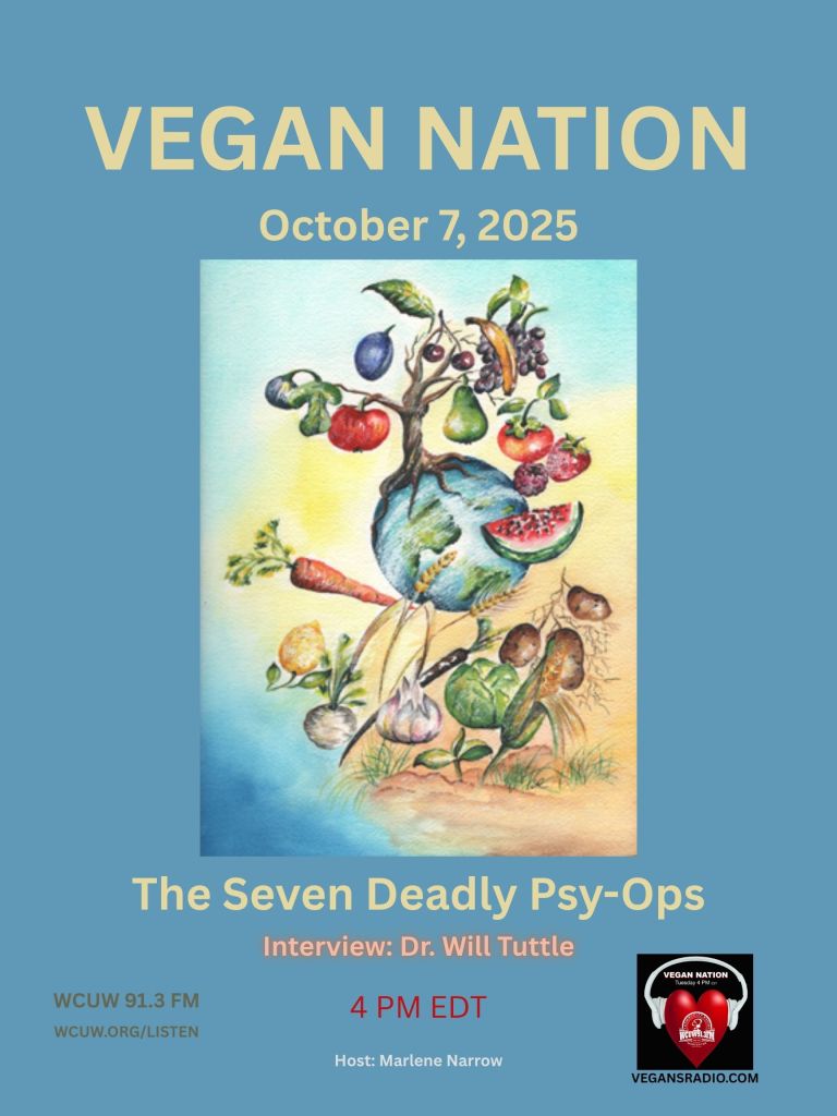 Hear the replay at the link above (29 minutes and 22 seconds, audio .mp3). Thank you. International lecturer and vegan author, Dr. Will Tuttle joins us from Northern California to discuss contemporary conversations currently underway in the global vegan community, and, in detail, his most recent essay, “The Seven Deadly Psy-Ops“. Tuesday, October 7, 2025, 4 PM EDT