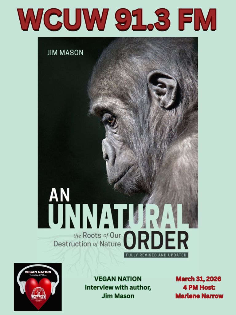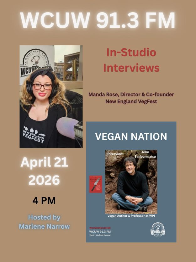To listen, click here: VEGAN NATION WCUW 91.3 FM replay (Apr 14, audio file active 2wks)