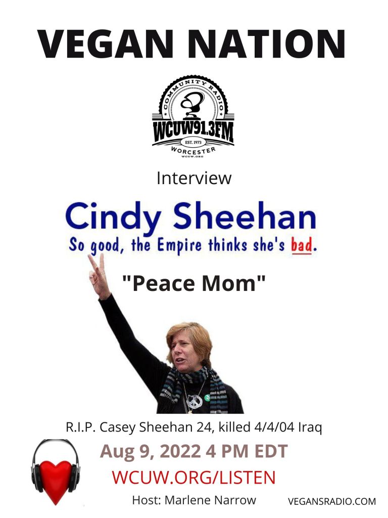 Vegan Nation features an interview with Cindy “Peace Mom” Sheehan (vegan), discussing peace, freedom, justice and nonviolence. Tune in Tuesday, August 9, 2022, WCUW 91.3 FM. Streaming worldwide at wcuw.org/listen . Vegan Nation airs Tuesdays 4 PM EDT. Hosted by Marlene Narrow, Worcester, Massachusetts, USA. Archived shows: vegansradio.com. Thank you for caring enough to hear & be heard; and for your compassionate activism. Music in this show by Will Tuttle (worldpeacediet.com)